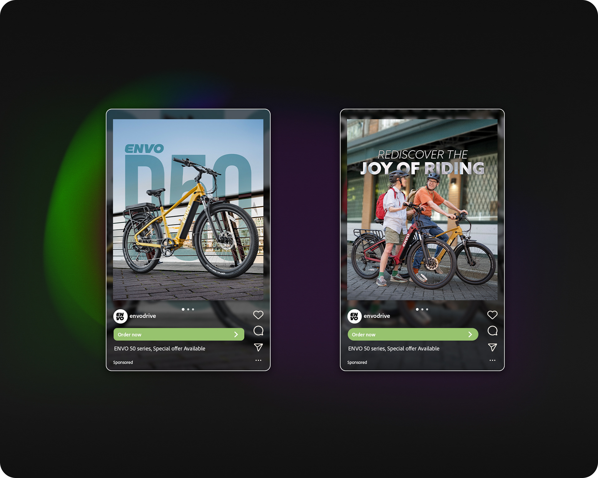 At Envo Drive Systems, a Vancouver-based electric mobility company, I led the photography and creative content for their e-bike lineup. The goal was twofold: first, to deliver studio-quality product photography that accurately represented the bikes across platforms; and second, to produce performance-based ad creatives that connected with specific user segments across Instagram, Facebook, and Google Ads.I handled both clean, detail-rich studio imagery and dynamic lifestyle visuals to convey the bikes' value across different use cases—from urban commuting to off-road adventure..The Challenge: