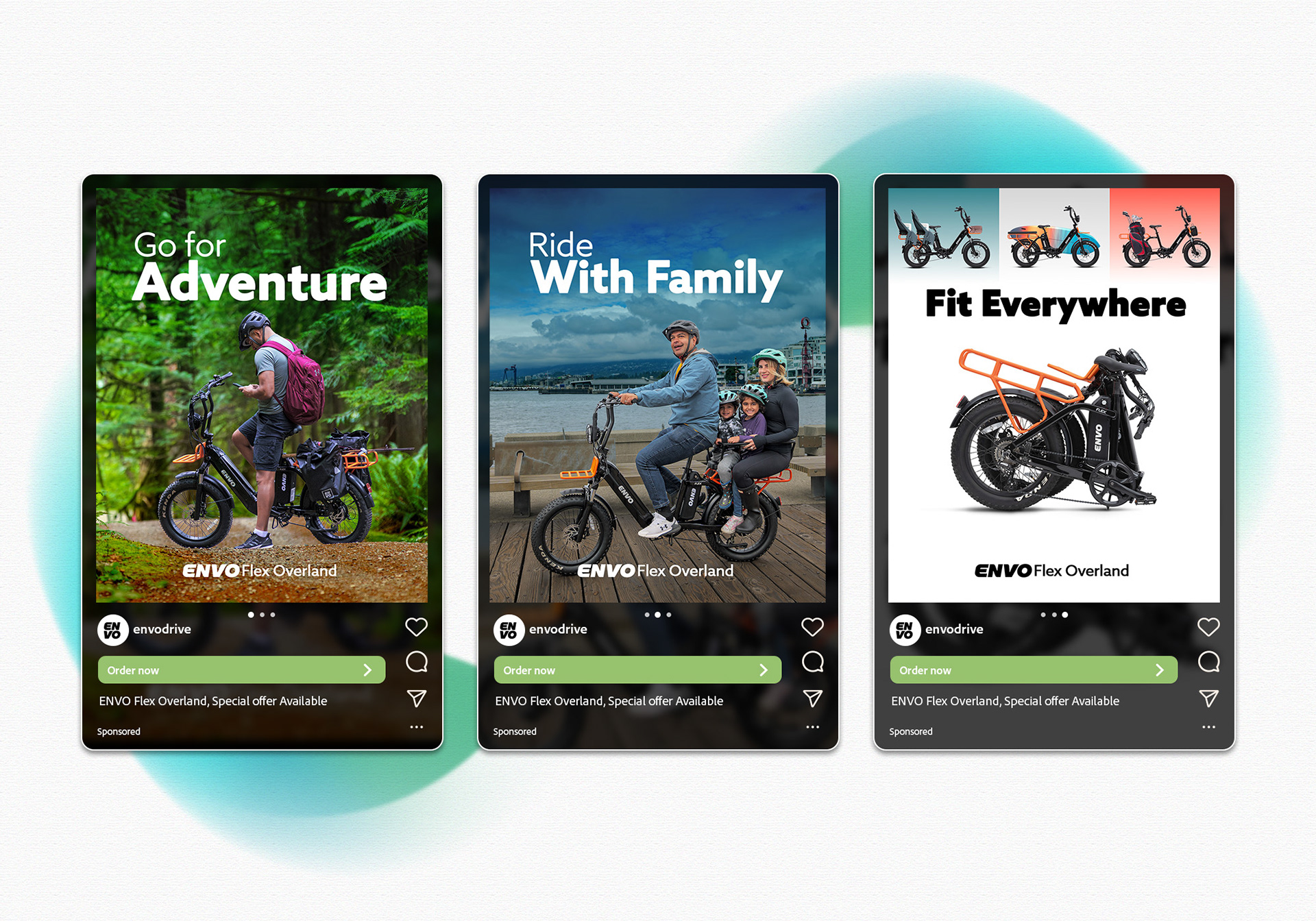 At Envo Drive Systems, I led photography and creative content for their e-bike lineup, producing both clean, detail-rich studio shots and dynamic lifestyle visuals tailored to different demographics. Working with limited equipment, I improvised lighting setups to capture technically accurate images while designing ad creatives for commuters, families, and outdoor enthusiasts. Through A/B testing and continuous optimization, the visuals became core assets across the website, ads, brochures, and social media—boosting trust, improving conversion rates, and driving measurable gains in engagement and ROI, all while strengthening Envo’s cohesive brand image and storytelling.
