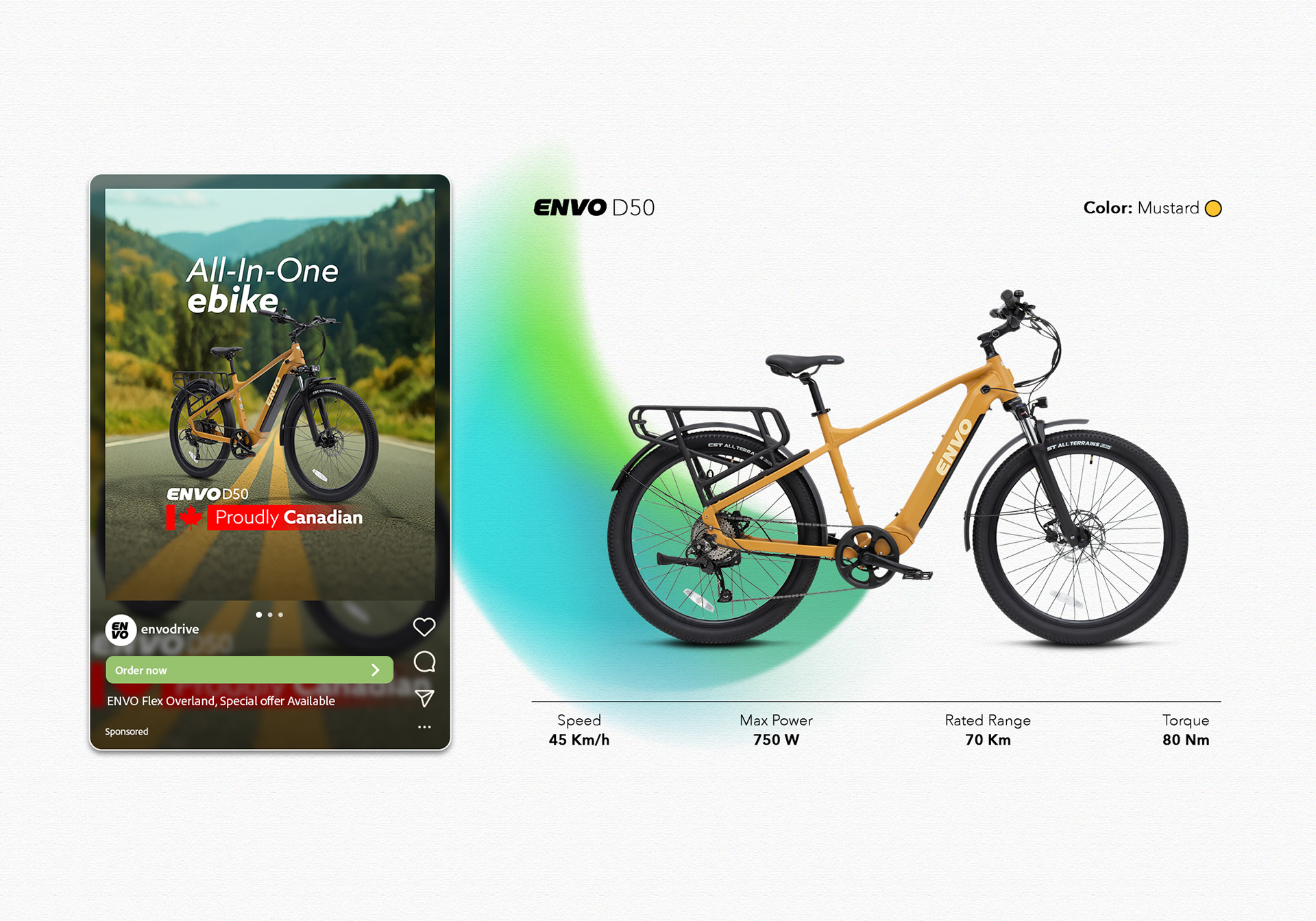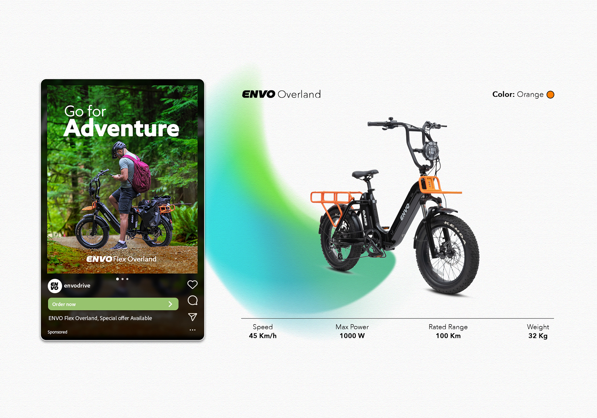 At Envo Drive Systems, I led photography and creative content for their e-bike lineup, producing both clean, detail-rich studio shots and dynamic lifestyle visuals tailored to different demographics. Working with limited equipment, I improvised lighting setups to capture technically accurate images while designing ad creatives for commuters, families, and outdoor enthusiasts. Through A/B testing and continuous optimization, the visuals became core assets across the website, ads, brochures, and social media—boosting trust, improving conversion rates, and driving measurable gains in engagement and ROI, all while strengthening Envo’s cohesive brand image and storytelling.